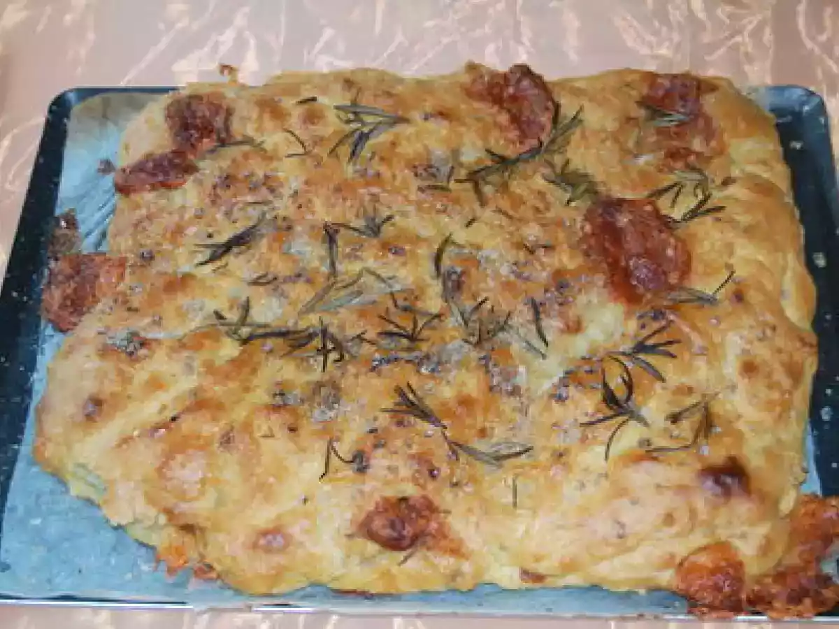 - Passé ce délai,préchauffer le four à 230 °. Prendre une plaque à pâtisserie, recouvre de papier cuisson. Verser la moitié de la pâte sur la plaque, poser sur cette pâte la mozzarella coupée en rondelles et remettre dessus le reste de pâte. Ensuite, de l'huile d'olive, du gros sel et du romarin, et hop, au four, pendant 20 à 30 minutes.