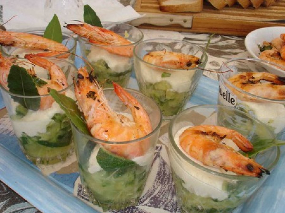 Verrine à la tapenade de courgette et sa crème de parmesan, crevettes