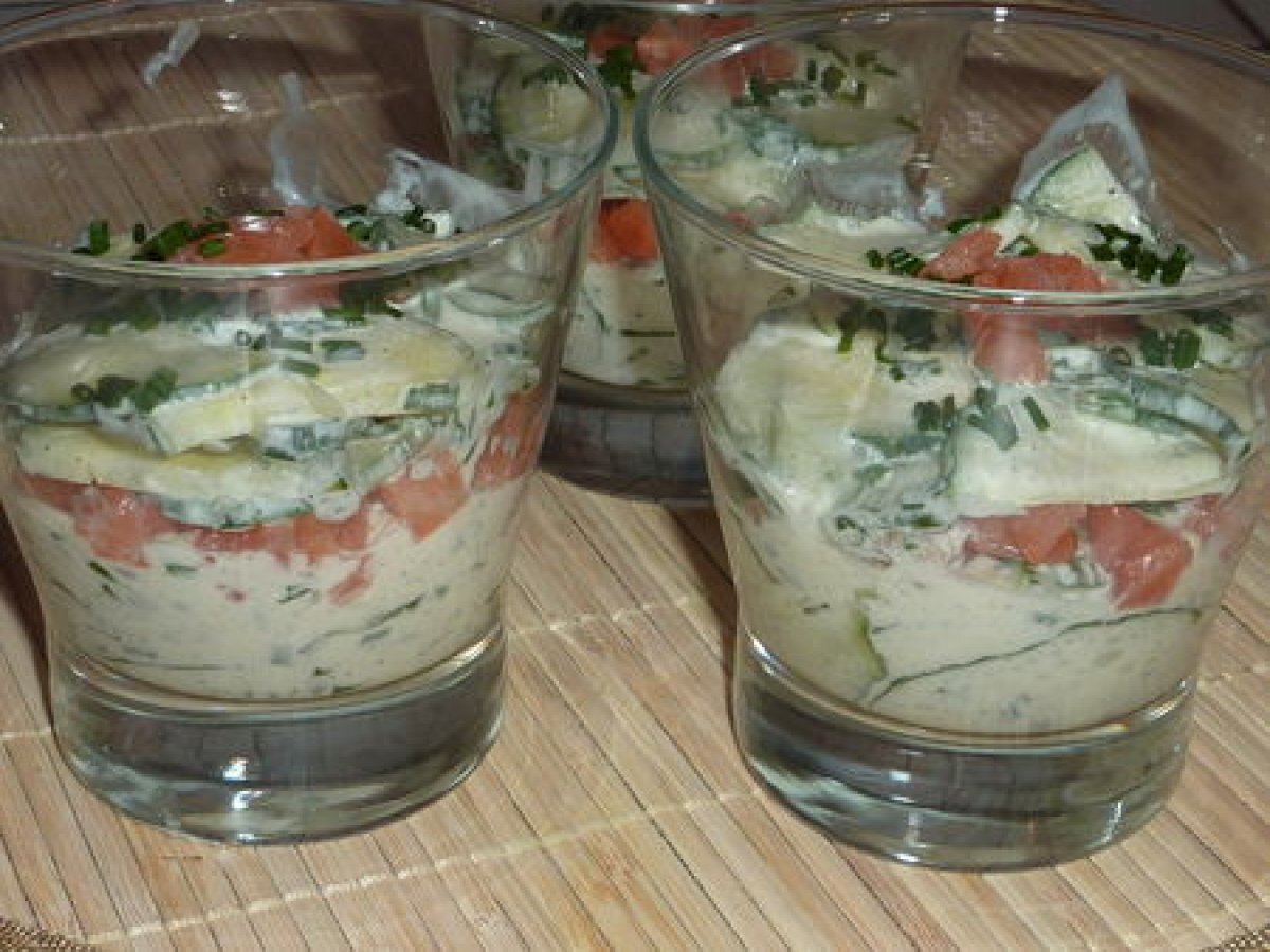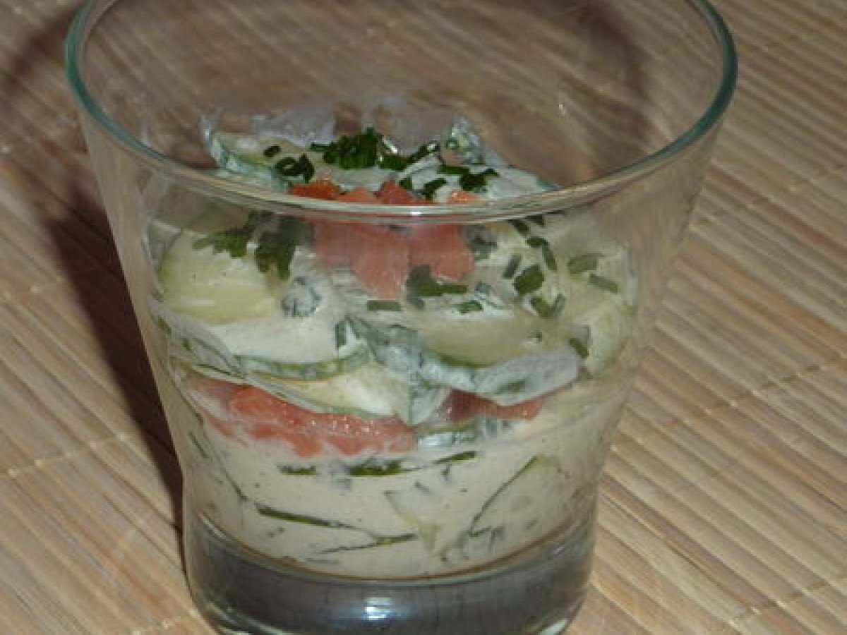 Verrine duo saumon-concombre PrécédentSuivant Apéritifmoyen15 min100 Kcal Envoyer cette recette à un ami Imprimer cette page Poser une question à l'auteur Publier votre photo de cette recette Ingrédients 4 1/2 concombre 75 g de saumon fumé en dés 4 cuillerées à soupe de crème fraîche épaisse 2 cuillerées à soupe de ciboulette 2 cuillerées à soupe de jus de citron sel, poivre Coût estimé: 5.92Euros€ (1.48€/part)