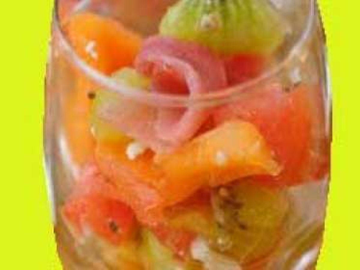Verrine sucrée salée PrécédentSuivant Apéritifmoyen15 min303 Kcal Envoyer cette recette à un ami Imprimer cette page Poser une question à l'auteur Publier votre photo de cette recette Ingrédients 3 Voici les ingrédients de la verrine sucrée salée ( 4 personnes ) : 1/4 de grosse pastèque 1/2 melon 2 kiwis 200 g de féta 2 tranches de jambon de Parme