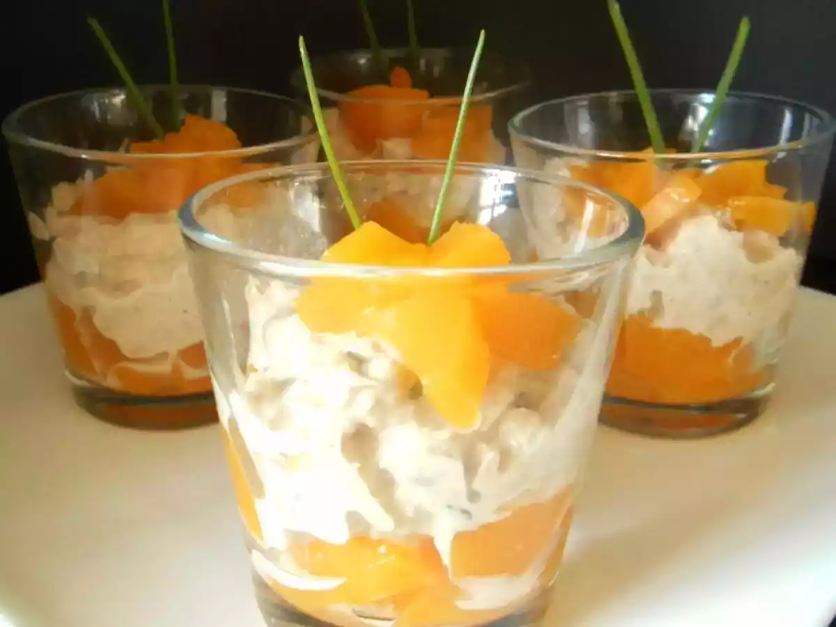 Verrines pêches & thon PrécédentSuivant Apéritiffacile15 min Envoyer cette recette à un ami Imprimer cette page Poser une question à l'auteur Publier votre photo de cette recette L’association sucrée / salée présentée en verrines.... Ingrédients 8 1 boîte de pêche au sirop (400 gr) 1 boîte de thon au naturel ( 140 gr poids net égoutté) 2 cuillères à soupe de mayonnaise sel poivre Ciboulette