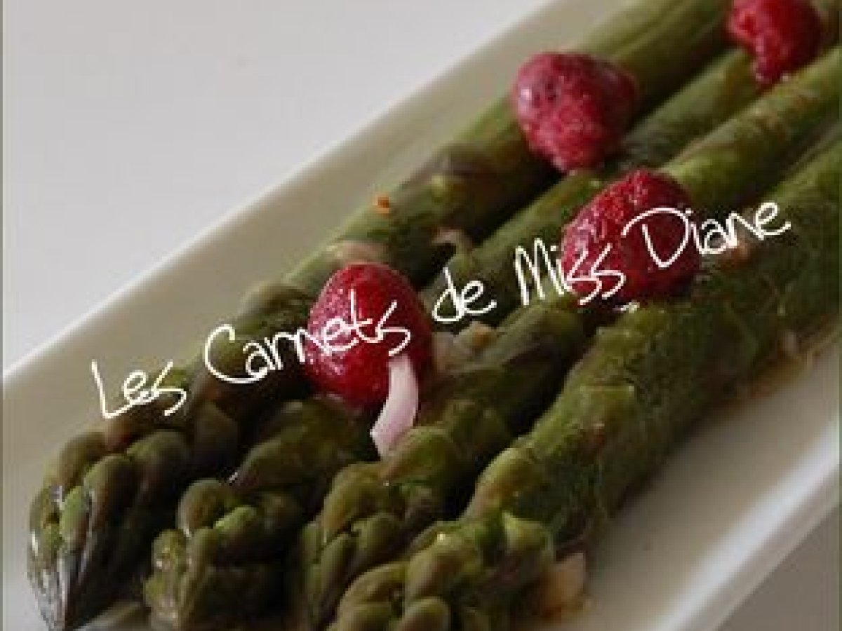 Asperges et framboises en vinaigrette au vinaigre de framboises... votez maintenant Autrefacile15 min Envoyer cette recette à un ami Imprimer cette page Poser une question à l'auteur Publier votre photo de cette recette Ingrédients 2 8 ou 10 têtes d'asperges le même nombre de framboises 4 cuillères à soupe d'huile de tournesol 1 cuillère à soupe de vinaigre de framboise 1 cuillère à thé de moutarde à l'ancienne 1 échalote française, hachée finement sel et poivre du moulin