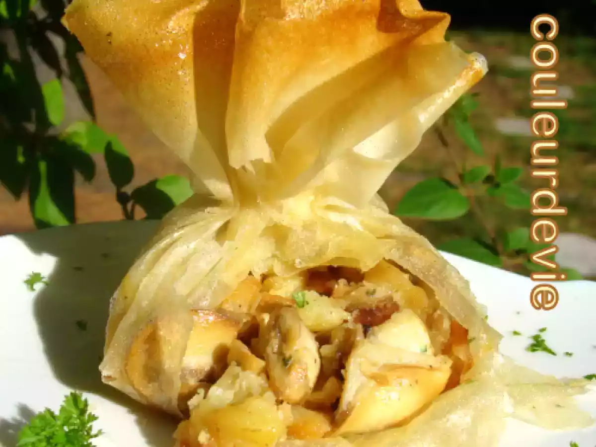 Une vrai aumônière devrait-elle pas se faire avec une crêpe ??? faite avec une pâte salée , soigneusement liée avec une tige de poireau .... tradition oblige , mes grand mère excellenteS cuisinière faisait ces préparation avec différents produit poissons, crustacés d'eau douce et volaille entre autre pintades ( découpées) avec des sauces et des champignons trompettes des morts ou morilles , c'est pour bientôt