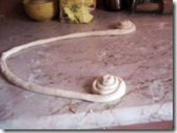 Prendre la première, fariner légèrement vos mains et roulez un boudin assez fin et assez long. Avec la première extrémité, roulez un escargot puis arrêtez vous au centre.