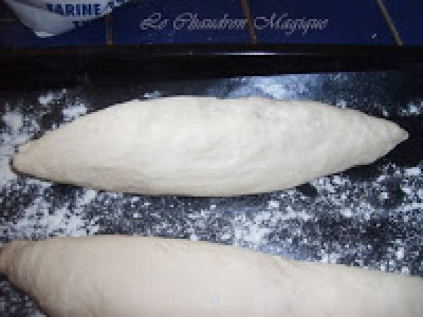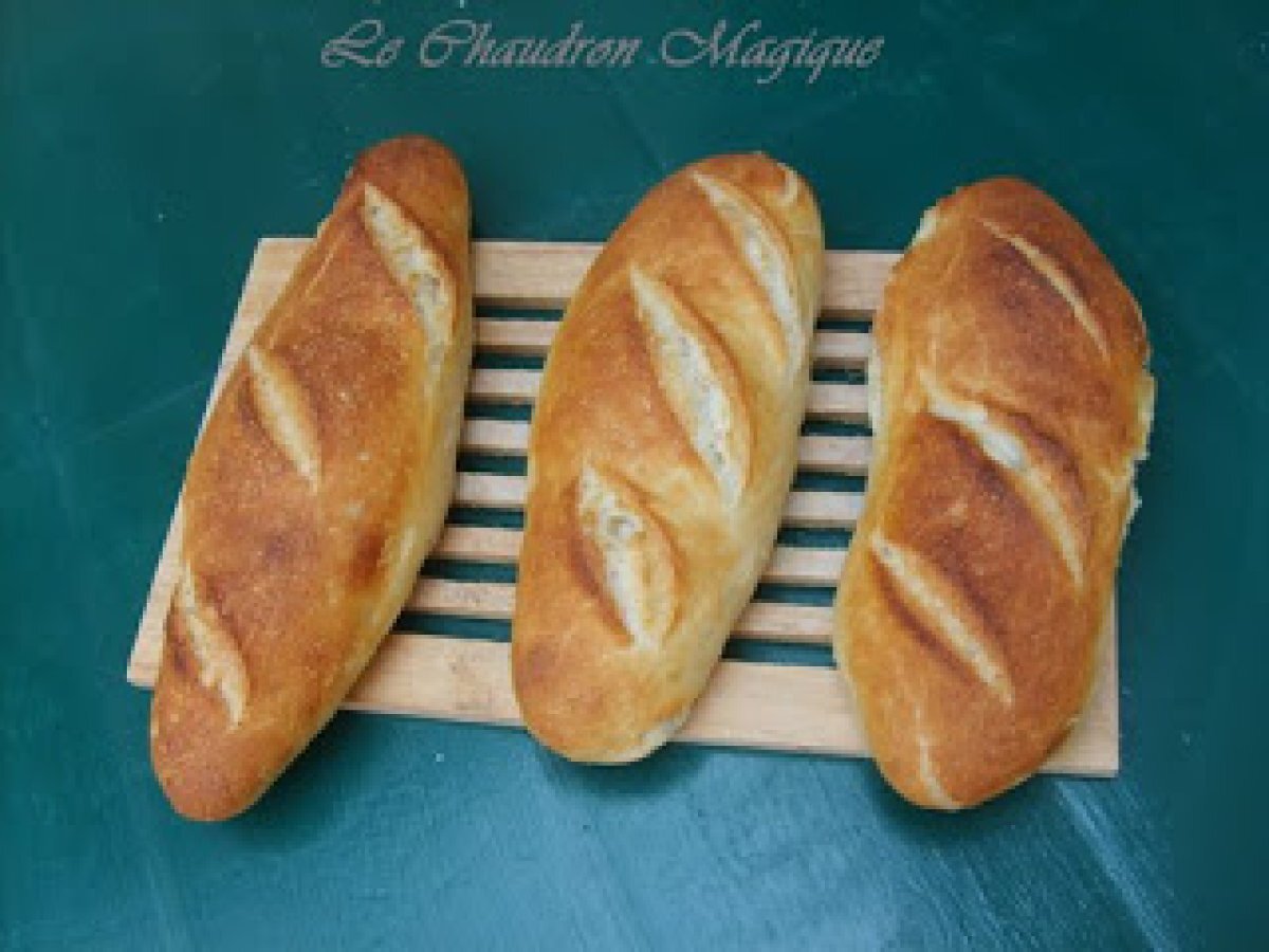Façonner les pâtons en baguettes sans trop travailler la pâte. Eliminer le trop de farine avec un pinceau. Couvrir et laisser monter 1 heure environ. Pendant ce temps, préchauffer le four à 240°; y mettre un moule allant au four rempli d'eau.- Faire 3 incisions par baguette avec une lame de rasoir humidifiée puis les vaporiser d'eau à l'aide d'un brumisateur ou éventuellement au pinceau. Enfourner et cuire environ 20 minutes, Lorsqu'il est bien doré éteindre le four et le laisser encore 5 minutes. Refroidir sur une grille.