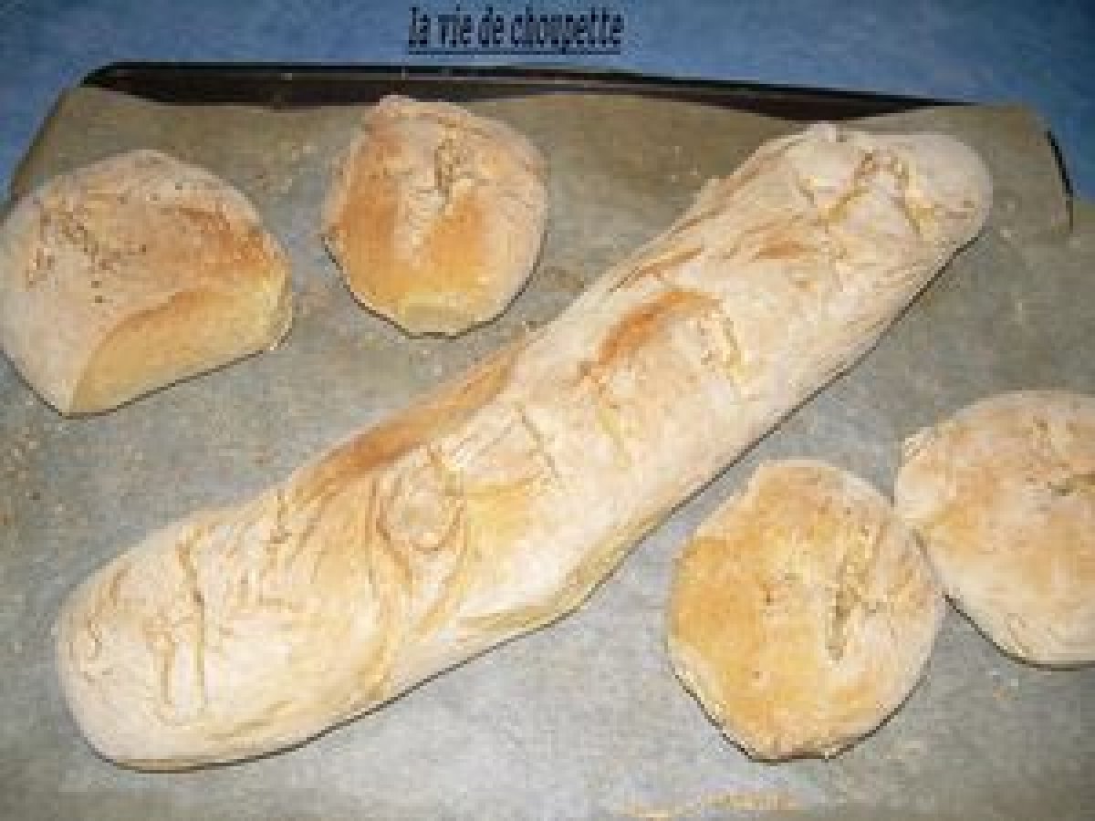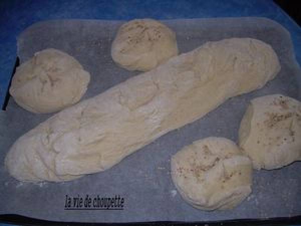 - Ensuite sortir pâte et faire une baguette et des petits pains, poser sur la plaque à pâtisserie recouverte d'un papier sulfurisé et laisser lever dans un endroit chauffé 40 minutes environ.