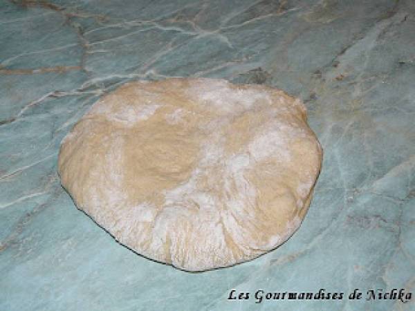 Si besoin, lors du pétrissage rapide, rajouter si besoin de la farine. Fariner votre plan de travail. Couper votre paton en 4. Former rapidement, grosso modo, des boules en tirant la pate sur les bords et les ramenant au milieu en dessous. Laisser se détendre pendant 20 à 30 minutes. Au bout de ce laps de temps, ils auront regonflé et seront souples.