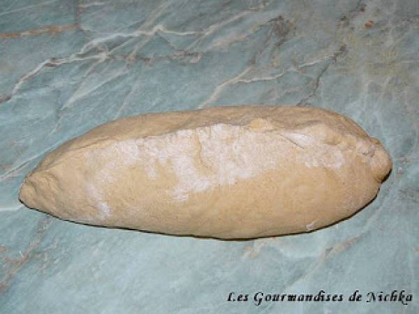 Etaler votre boule en ovale à l'aide de la paume de votre main, ne pas hésiter à dégazer (évacuer l'air contenu dans la pate). Plier votre paton comme un chausson aux pommes, c'est-à-dire en 2 dans le sens le plus long, de façon à ce qu'il soit plier sur lui-même. Bien seller la clé, c'est-à-dire la jointure de pliage, la pate doit coller à cet endroit (sinon, votre baguette éclatera à la jointure).