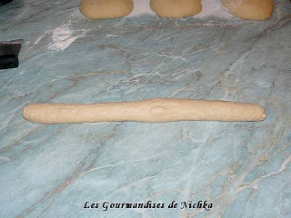 Retourner votre "chausson", clé vers le haut. A l'aide de la paume de votre main, appuyer votre paton en soulevant les cotés afin qu'il s'étale dans sa longueur. Refaire un chausson. On a déjà la forme et la longueur d'une demi-baguette. Maintenant, rouler avec vos mains : mains au centre, et on roule en allant vers l'extérieur pour faire un long boudin. Toujours du milieu vers les extrémités afin d'avoir un boudin bien régulier. Et on pose la paume de ses mains sur la pate, on ne roule pas uniquement avec ses doigts.