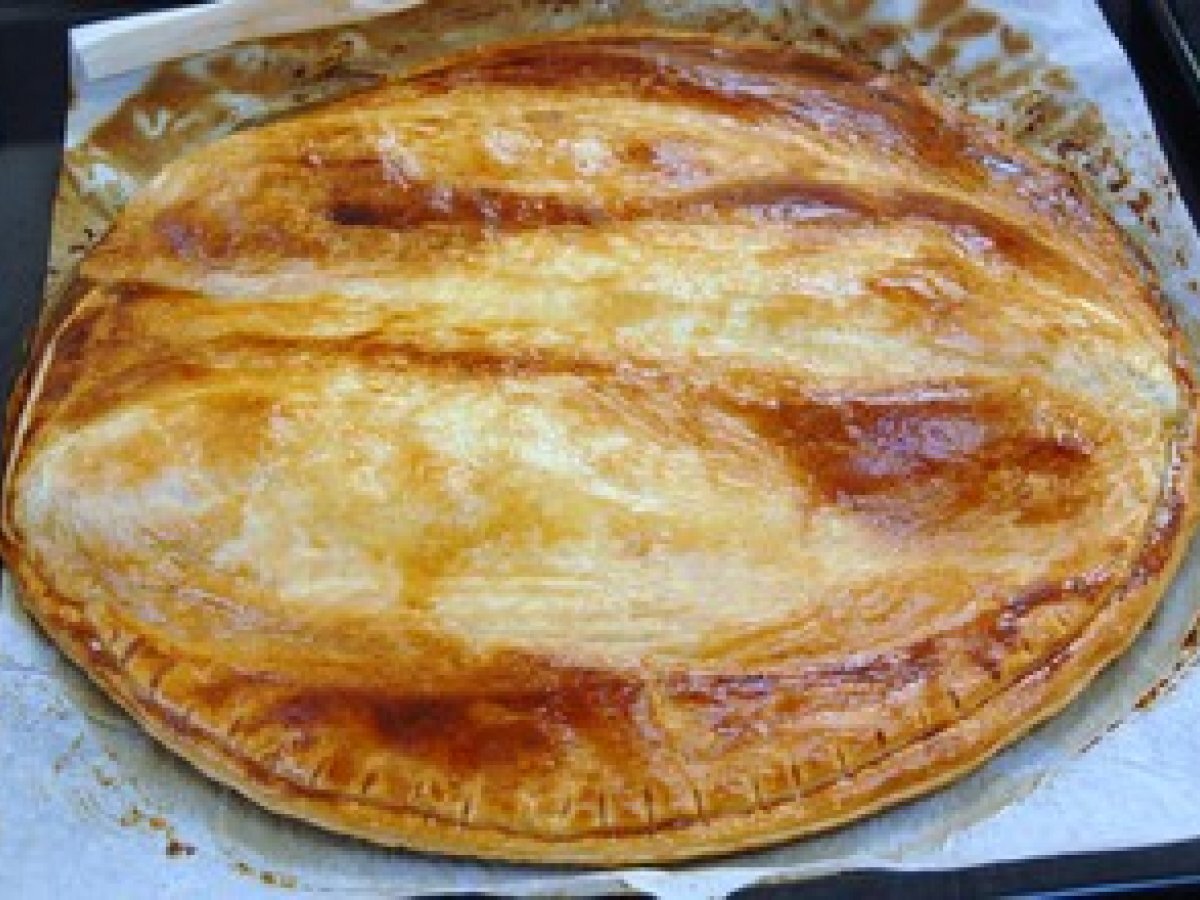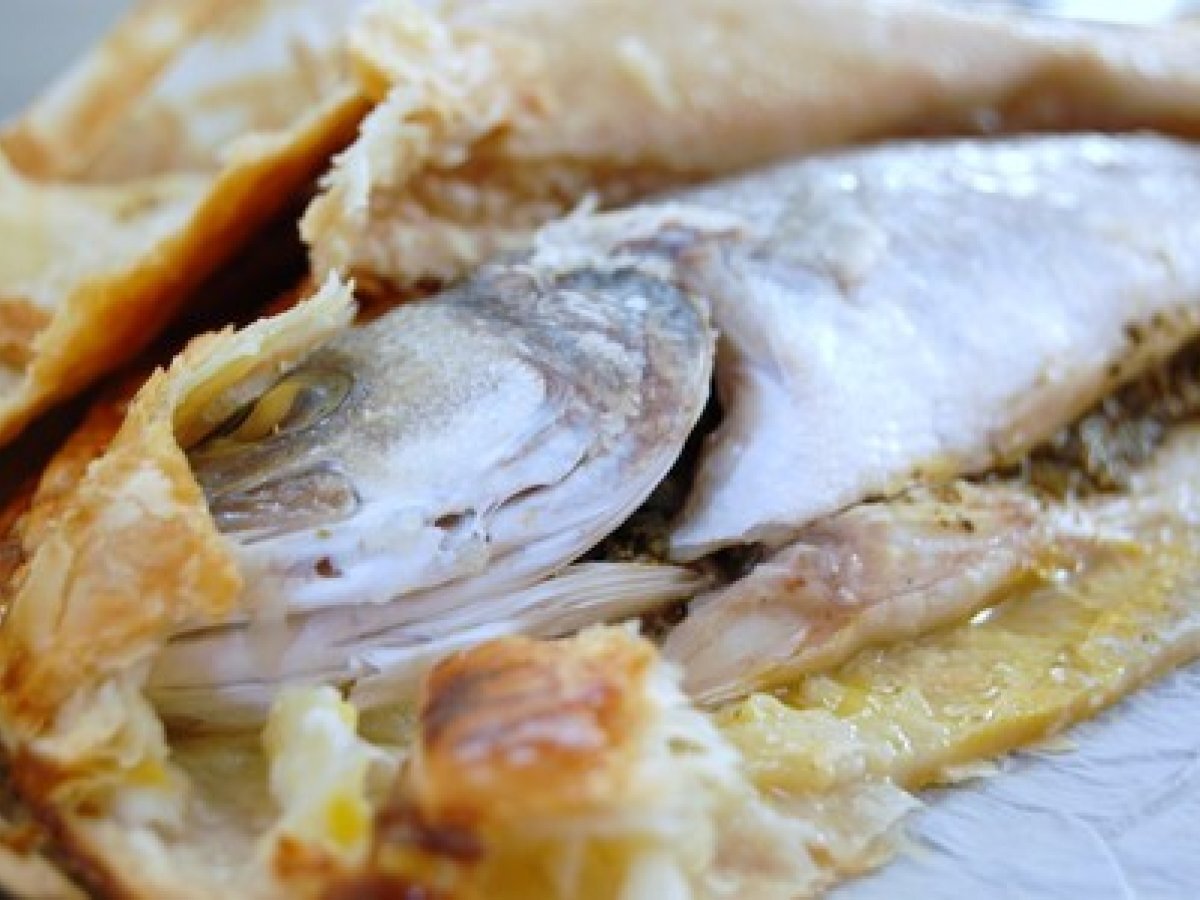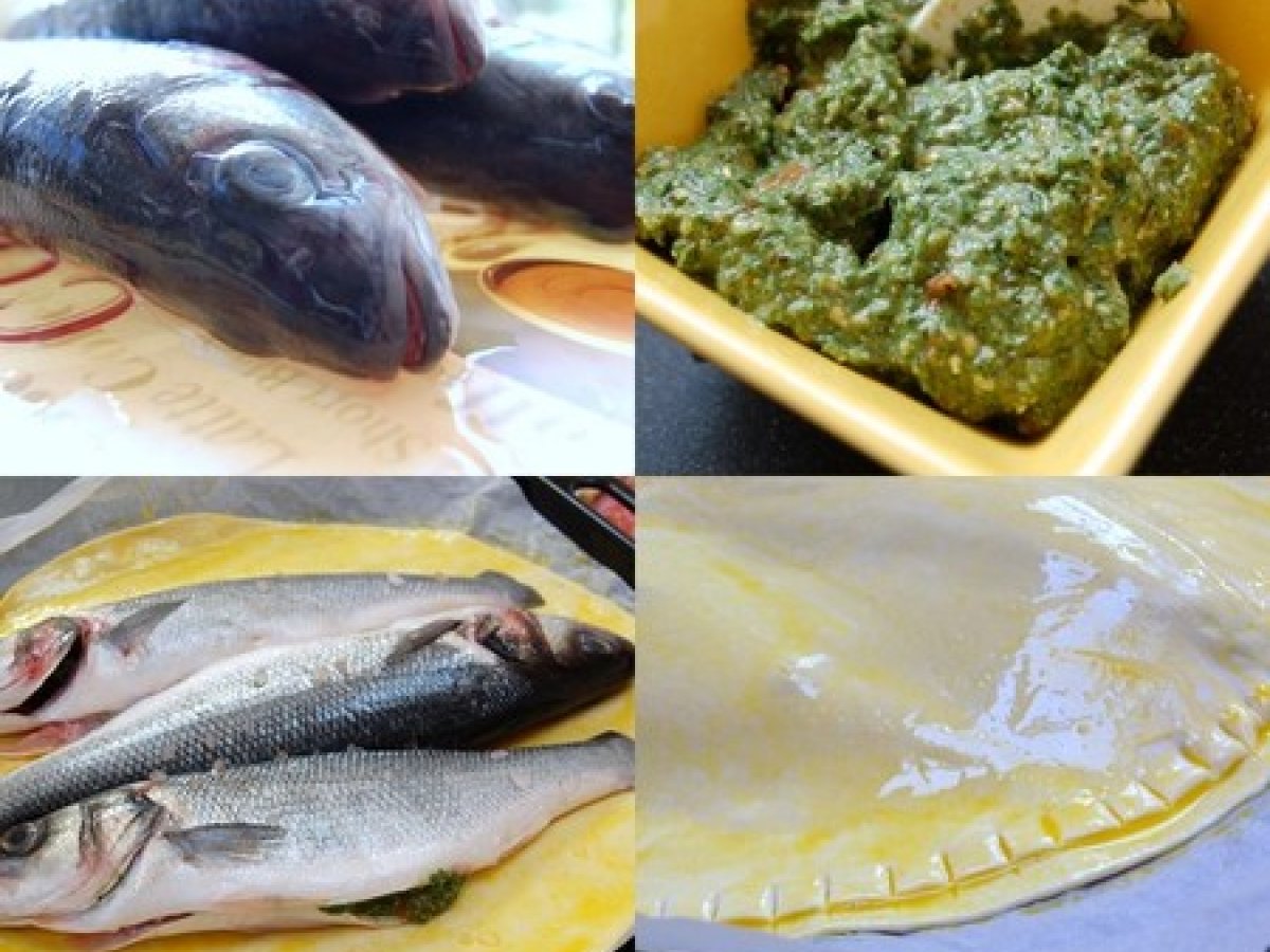 Bar farci à l'oseille cuit au four en croute de pâte feuilletée