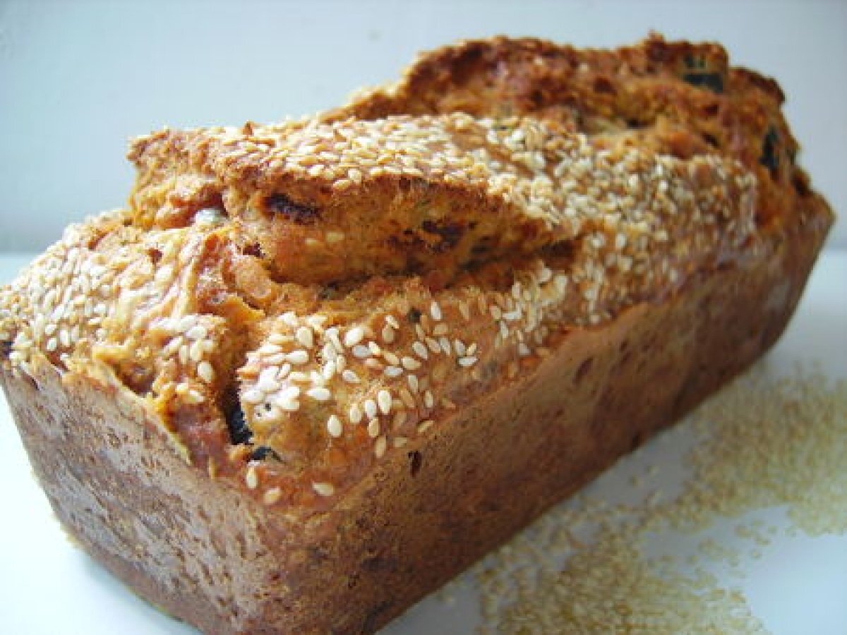 Cake de tomates séchées, olives noires, bleu de gex et graines de sésame