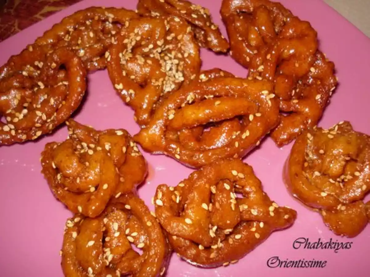 Chabakiyas (patisserie marocaine) PrécédentSuivant Autrefacile20 min Envoyer cette recette à un ami Imprimer cette page Poser une question à l'auteur Publier votre photo de cette recette Pour terminer le ramadan. Ingrédients 8 500 g de farine blanche 100 g de poudre d'amandes (facultatif mais bien meilleur avec) 125 g de graines de sésame dorées et moulues 1 verre à thé de ½ beurre fondu et ½ huile neutre 2 verres à thé de fleur d?oranger (plus ou moins pour ramasser la pâte) ½ cuillère à café de levure chimique 1 cuillère à soupe de levure boulangère sèche 1 jaune d'oeuf 1 coquille d'oeuf de vinaigre (incolore) 1 cuillère à café d'anis grillé à sec et moulu 1 cuillère à café de cannelle moulu 1 bonne pincée de gomme arabique (pas mis) ½ cuillère à café rase de sel ¼ cuillère à café de safran pur de bonne qualité Huile pour la friture 1 kg de miel 1 bol environ de graines de sésame dorées