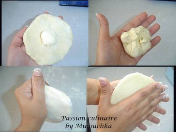 Aplatir un peu la pâte avec vos doigts ou au rouleau pâtissier. - Disposer au centre une portion de fromage, renfermer puis reformer une boule parfaite.
