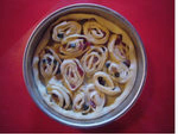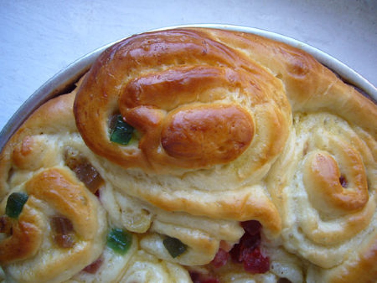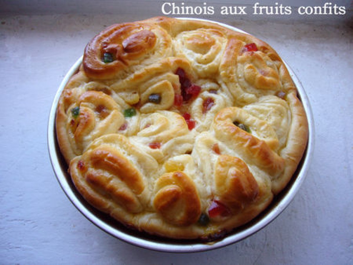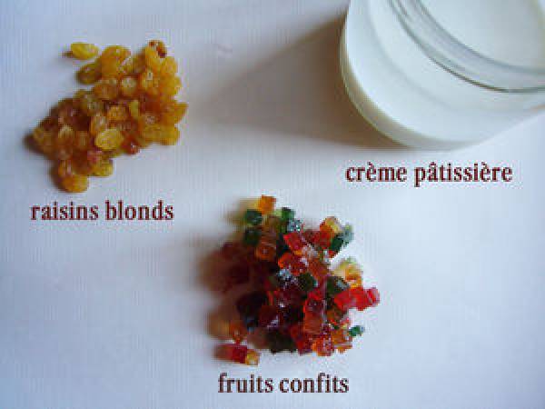 Etaler le reste de la pâte en un rectangle. Couvrir de crème pâtissière puis des raisins égouttés et des fruits confits. Rouler comme une buche et découper en 12 tronçons.- Les placer dans le moule, rabattre un peu les bords et laisser gonfler 40 minutes. environ. Badigeonner d'un mélange œuf + eau.