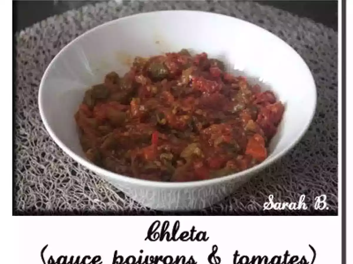 Chleta (sauce aux poivrons et tomates) Autremoyen1 heure105 Kcal Envoyer cette recette à un ami Imprimer cette page Poser une question à l'auteur Publier votre photo de cette recette Ingrédients 4 6 tomates 3 poivrons rouge 2 poivrons vert 2 piment (pour ceux qui aime le piment) sel huile d'olive ail en poudre (facultatif) Coût estimé: 3.51Euros€ (0.88€/part)