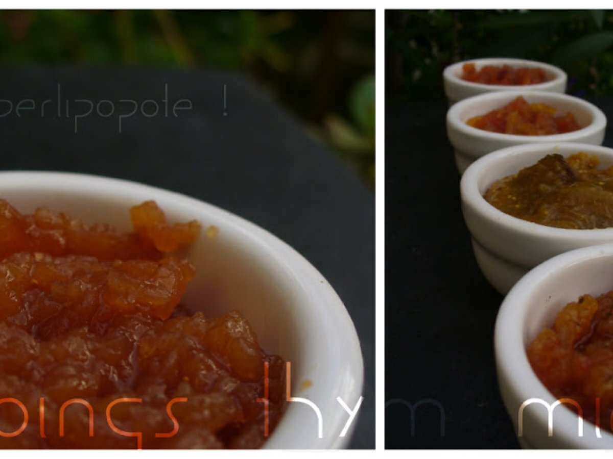 Vous pouvez en garder une partie dans laquelle vous ajoutez la maniguette pilée pour faire la variante coing-pamplemousse et graines du paradis. Puis la mettre en pots. - 3) Pour 9 pots de confiture de coings au thym et miel de tilleul :