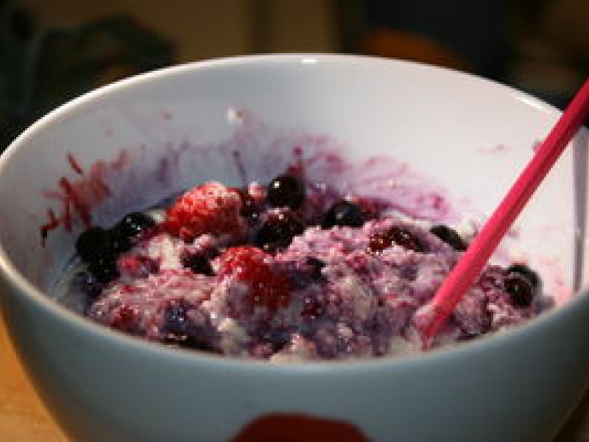 - Verser dans un bol ou une assiette creuse, sucrer éventuellement, ajouter les fruits rouges qui vont décongeler en quelques secondes et dont le jus va se mélanger au porridge !!