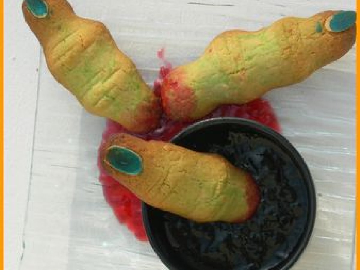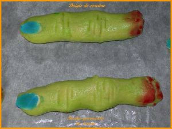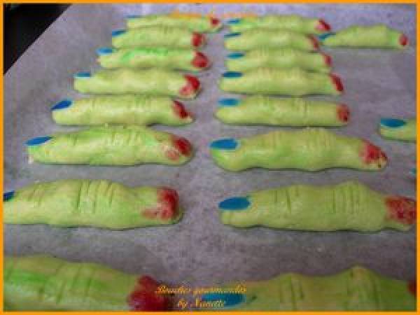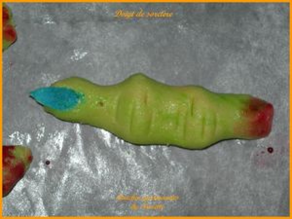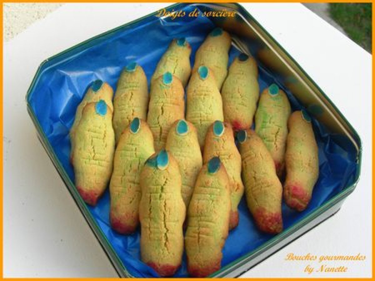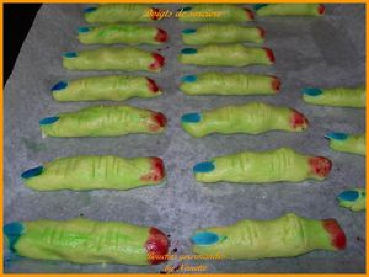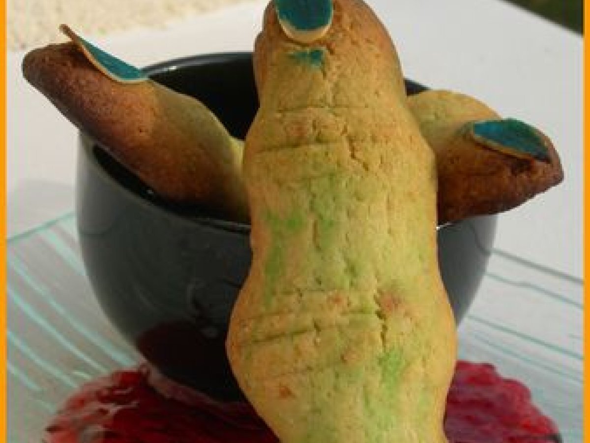 Doigts de sorcière ou doigts d'ogre ? PrécédentSuivant Autrefacile40 min Envoyer cette recette à un ami Imprimer cette page Poser une question à l'auteur Publier votre photo de cette recette Ingrédients 5 100 g de beurre mou 100 g de sucre glace 1 sachet de sucre vanillé 200 g de farine 50 g de poudre d'amande 1 oeuf 1 cuillère à café d'extrait d'amandes amères 1 cuillère à café de levure chimique 1 pincée de sel quelques gouttes de colorant alimentaire quelques amandes effilées un peu de gelée de mûre