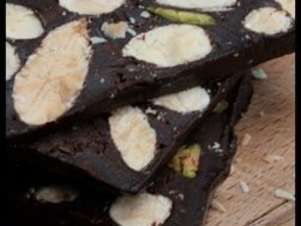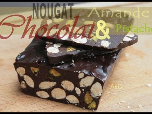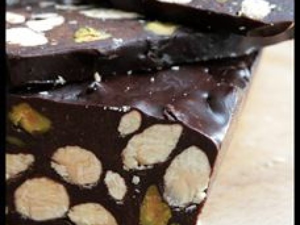 Du nougat au chocolat noir incrusté d' amandes et de pistaches grillées .