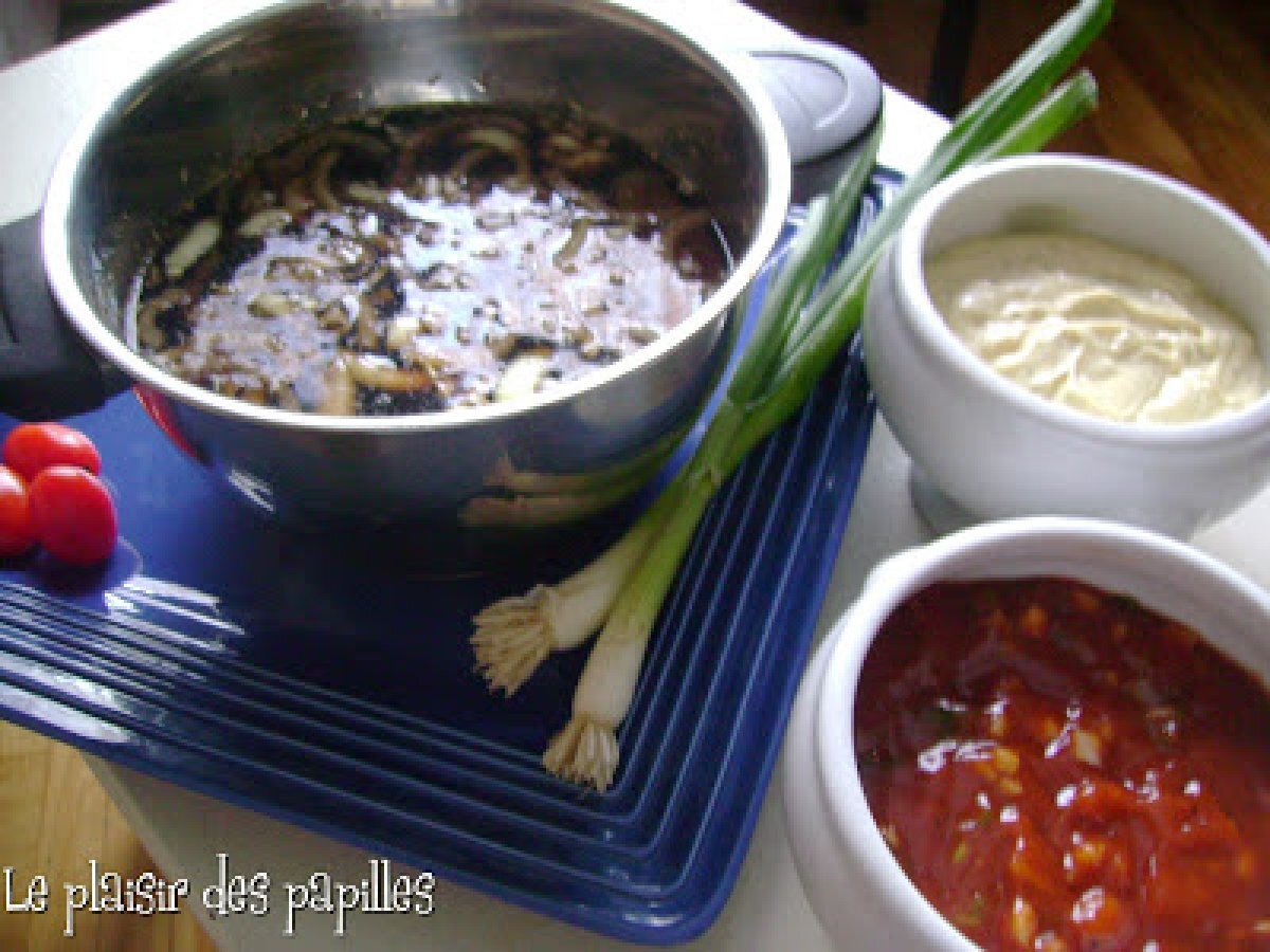 ~fondue chinoise~ Autrefacile12 min704 Kcal Envoyer cette recette à un ami Imprimer cette page Poser une question à l'auteur Publier votre photo de cette recette Ingrédients 4 1 oignon en rondelles 3 tasses de bouillon de boeuf 2 cuillères à table de sauce soya 1 cuillère à thé de sauce Worcestershire 1 feuille de laurier 1 pincée de sauge 1 pincée de romarin ou de thym Poivre du moulin SAUCE DIABOLO : 3 gousses d'ail hachées 3 échalotes hachées (moi 2) 1/4 tasse d'huile végétale 2 cuillères à soupe de vinaigre blanc 1/2 tasse de ketchup sel poivre 2 cuillères à soupe de sauce worcestershire 1 cuillère à thé de moutarde sèche 1 cuillère à soupe de cassonade SAUCE DIJONNAISE ET HERBES DE PROVENCE : 1 tasse de mayonnaise 2 bonnes cuillères à soupe de moutarde de Dijon 1/2 cuillère à thé d'herbes de Provence 1/4 cuillère à thé de sel de céleri Poivre Coût estimé: 7.79Euros€ (1.95€/part)