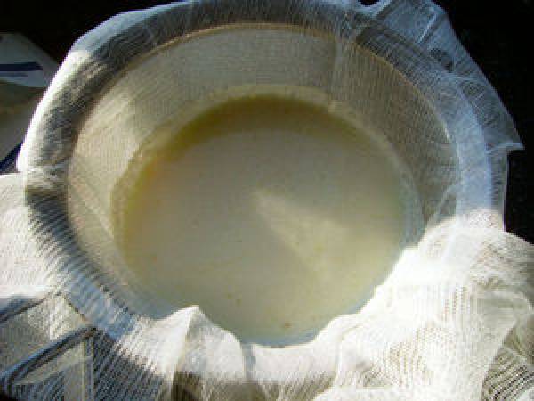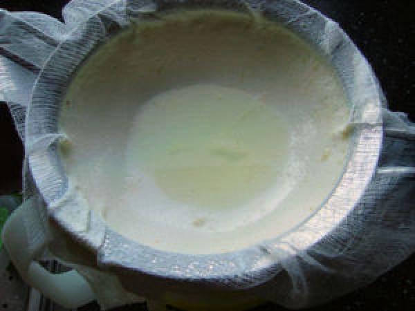 On met une passoire très fine recouverte d'une gaze sur un récipient et on verse doucement le lait dessus.