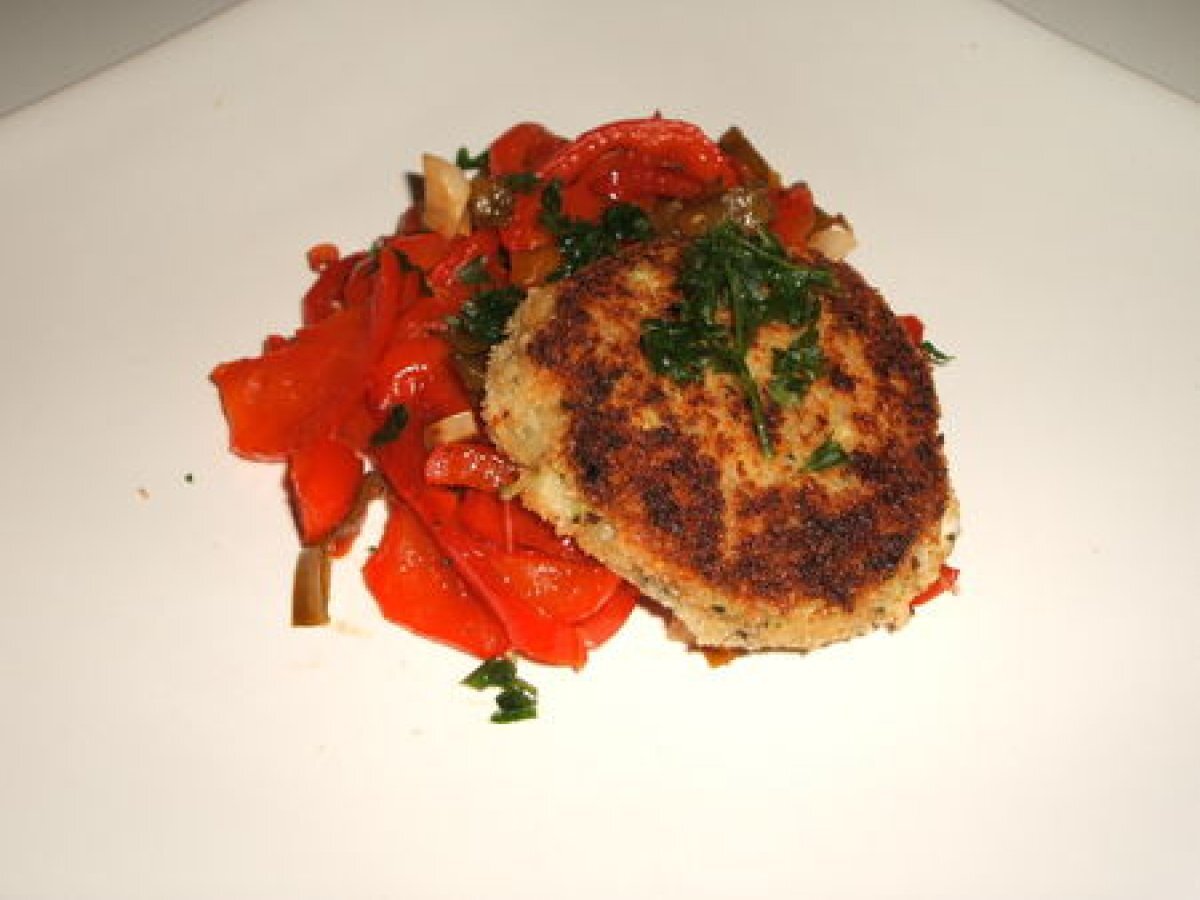 Galettes de pommes de terre, courgette et feta - fondue de poivrons & piment