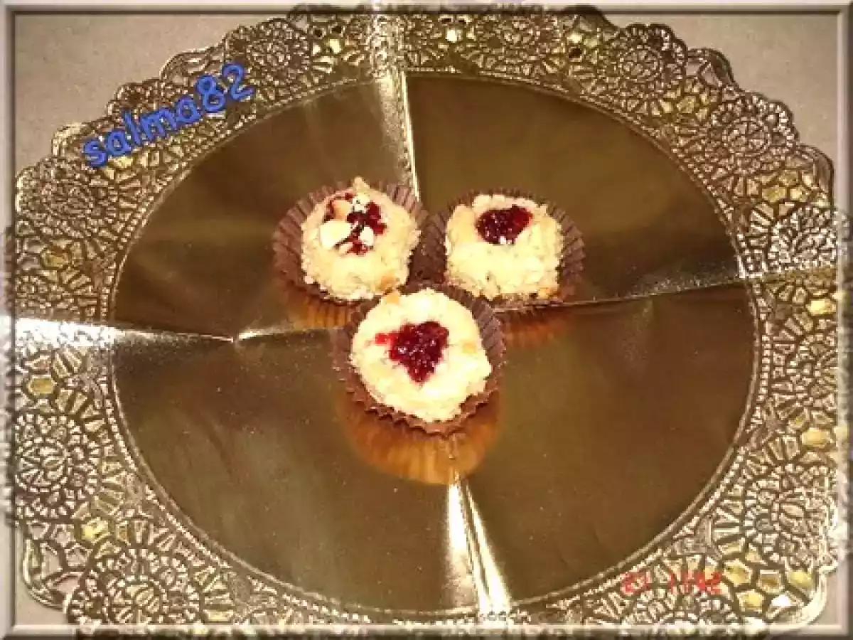Faire des petite boules, trempez les boules dans du blanc d'oeuf puis dans les amandes apuiyez au centre de la boule pour avaoir un petit trou.- Enfournez le four doux pendant 15 minutes.