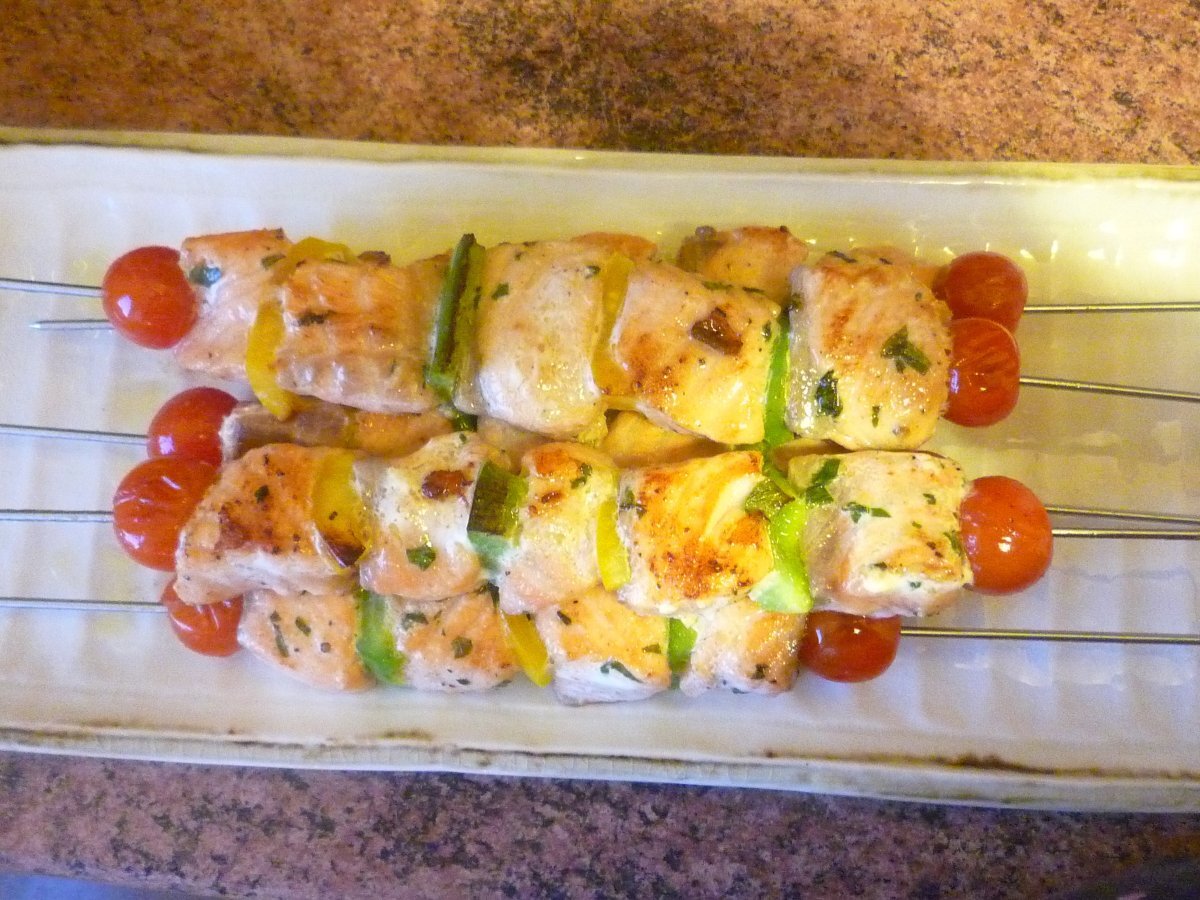 Mes brochettes de saumon au gingembre et au basilic Autrefacile25 min153 Kcal Envoyer cette recette à un ami Imprimer cette page Poser une question à l'auteur Publier votre photo de cette recette Ingrédients 8 2 gros pavés de saumon ( assez épais ) 2 gousses d'ail 8 feuilles de basilic 1 c. à soupe rase de gingembre moulu 1 poivron jaune 1 poivron vert 12 Tomates cerises 6 c. à soupe d' huile d'olive Sel / poivre Coût estimé: 6.49Euros€ (0.81€/part)
