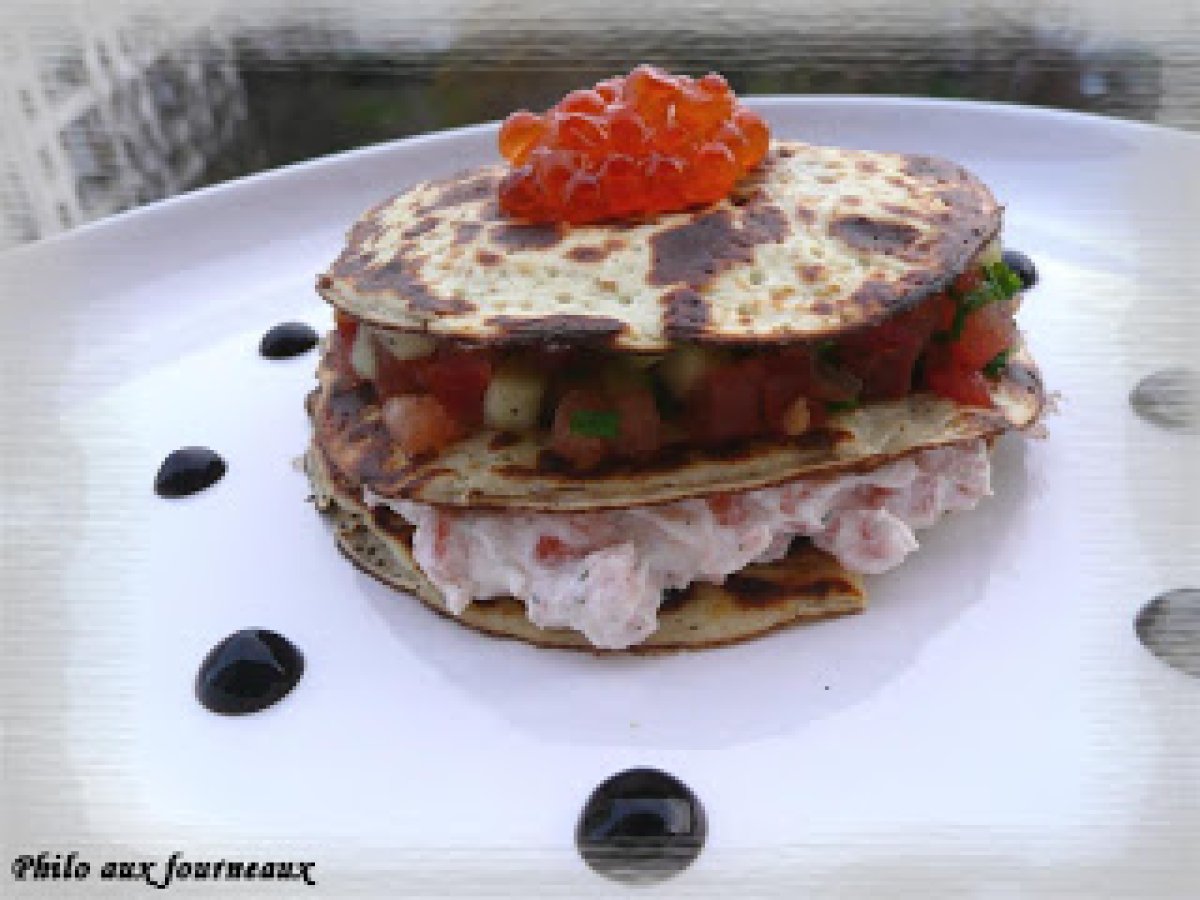 Millefeuille de crêpes à la ricotta, saumon frais & petits légumes