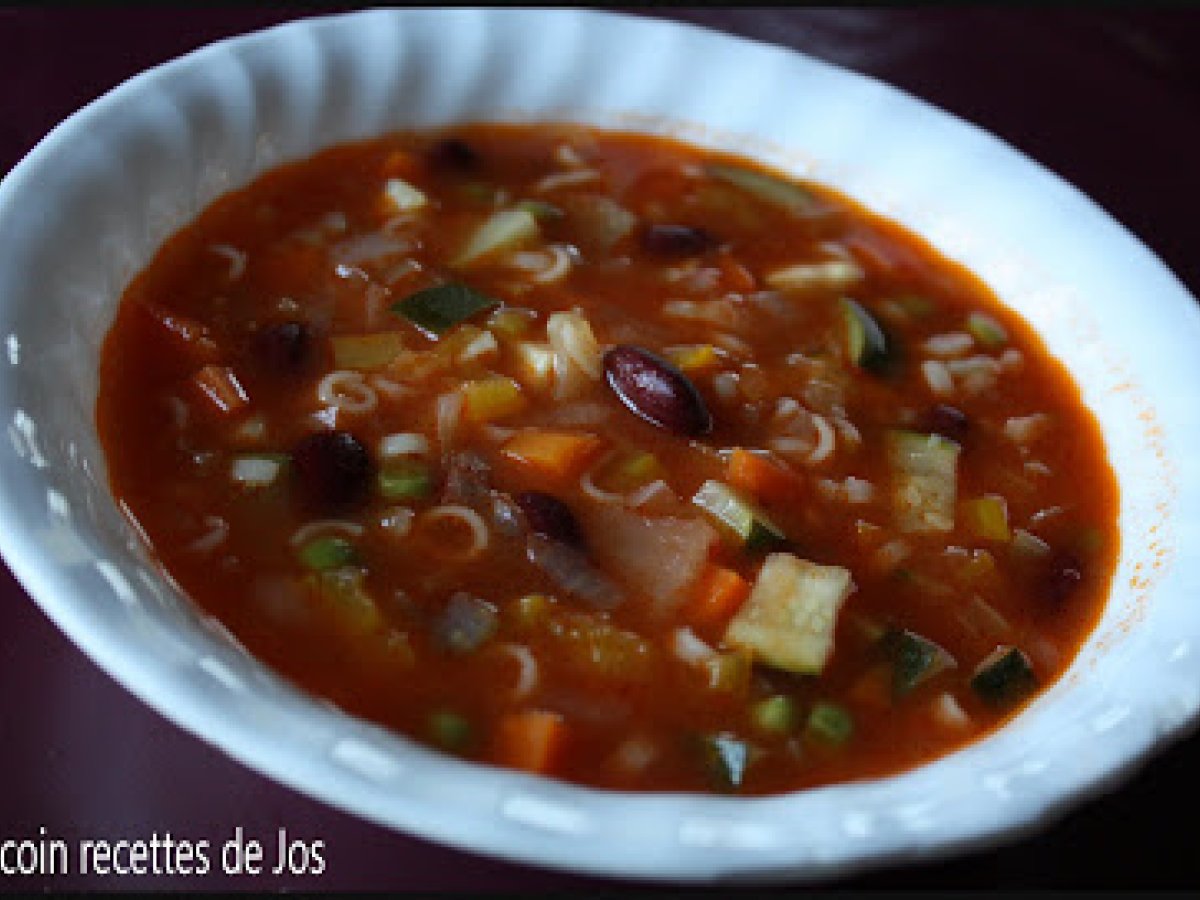 MINESTRONE AU JUS DE TOMATE votez maintenant Autrefacile47 min Envoyer cette recette à un ami Imprimer cette page Poser une question à l'auteur Publier votre photo de cette recette Ingrédients 4 4 gousses d'ail, tranchées 2 cuillères à soupe d'huile d'olive 2 oignons, hachés 2 carottes, coupées en dés 2 branches de céleri, coupées en dés 3 tasses de jus de tomate 3 tasses de bouillon de poulet (plus ou moins) 1/2 tasse de petites pâtes alimentaires 2 courgettes, coupées en dés 1 boîte de 540 ml (19 oz) de haricots rouges, rincés et égouttés 1 poivron jaune, épépiné et coupé en dés 1 tasse de petits pois frais ou 1 tasse de petits pois surgelés Sel poivre