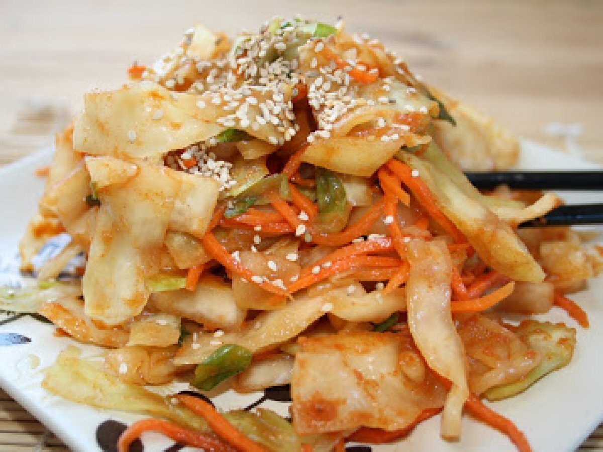 - Bien égoutter le chou et le mettre dans un grand bol avec les carottes en julienne et les oignons verts taillés en biseau. Ajouter la sauce et bien mélanger.
