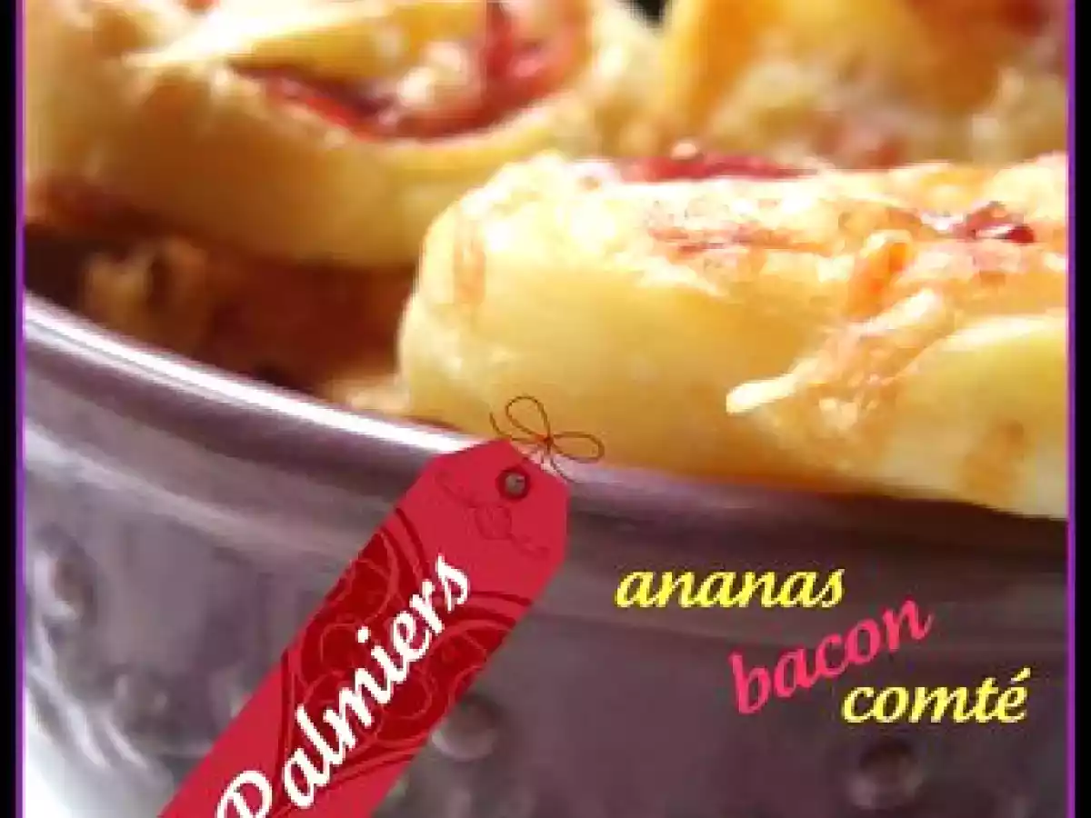 Palmiers ananas, bacon et comté PrécédentSuivant Autrefacile40 min Envoyer cette recette à un ami Imprimer cette page Poser une question à l'auteur Publier votre photo de cette recette Ingrédients 4 une ou deux tranches d'ananas au sirop ( selon vos restes ou goût) 100 g de bacon coupé finement 100 g de comté râpé 1 rouleau de pâte feuilletée