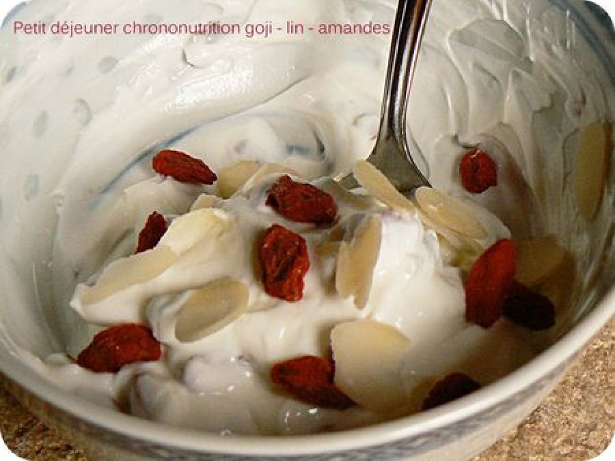 - Mélangez 2 petits suisses avec 1 cuil à soupe de baies de goji macérées la veille dans du jus d'açaï, 1 cuillère à café de graines de lin, 1 cuillère à soupe d'amandes effilées.