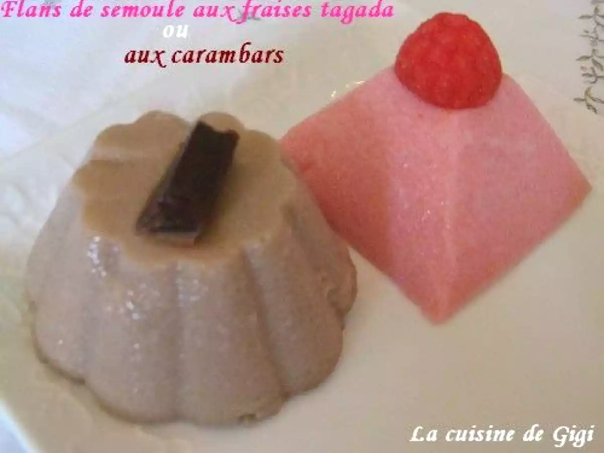 Petits flans de semoule aux fraises tagada ou aux carambars votez maintenant PrécédentSuivant Autrefacile15 min390 Kcal Envoyer cette recette à un ami Imprimer cette page Poser une question à l'auteur Publier votre photo de cette recette Ingrédients 6 Aux fraises tagada : 1 litre de lait 75 g de semoule fine 50 g de sucre en poudre 25 fraises tagada Aux carambars : 1 litre de lait 75 g de semoule fine 50 g de sucre en poudre 15 carambars