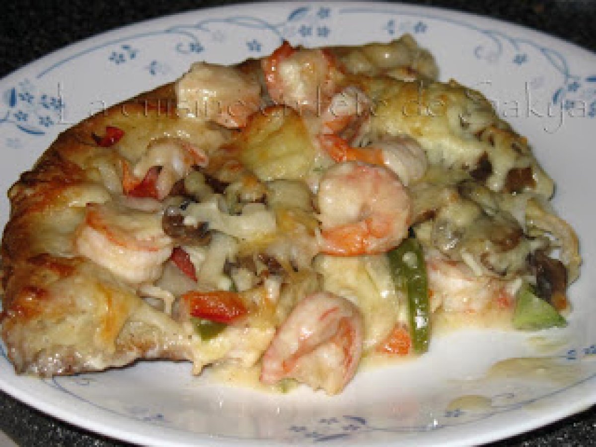 Cette pizza est savoureuse, une bonne béchamel au citron avec crevettes et recouverte de bons légumes frais!!