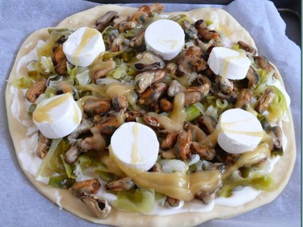 Pizza poireaux-moules-chèvre et miel votez maintenant PrécédentSuivant Autrefacile1 heure Envoyer cette recette à un ami Imprimer cette page Poser une question à l'auteur Publier votre photo de cette recette Ingrédients 4 12.5 cl d'eau tiède 2 cl d'huile 220 g de farine T55 1/2 sachet de levure (à pain) une pincée de sel Garniture : 200 g de moules (ici des surgelées) 2 blancs de poireau 30 cl de vin blanc sec 2 cuillères à soupe de crème fraîche épaisse 6 rondelles de chèvre frais 1 cuillère à soupe de miel un peu de gruyère râpé