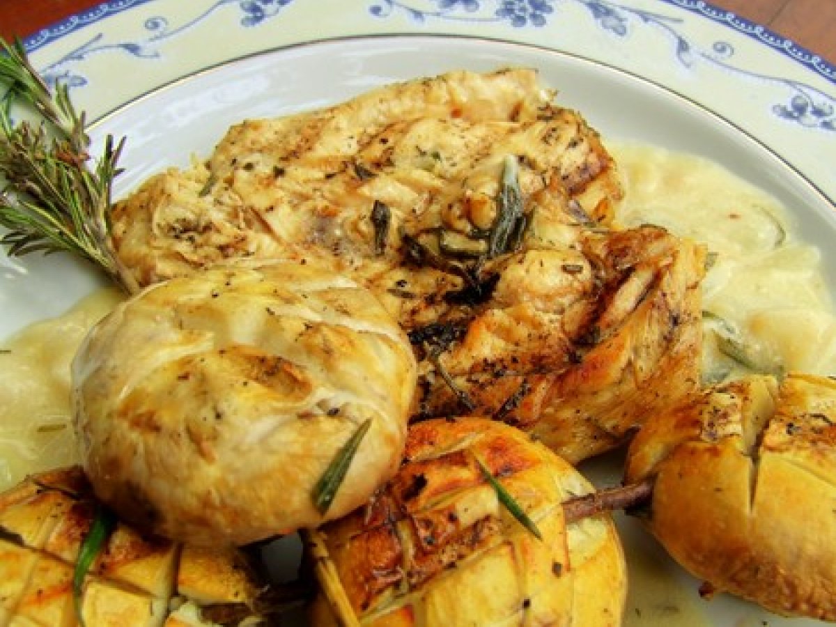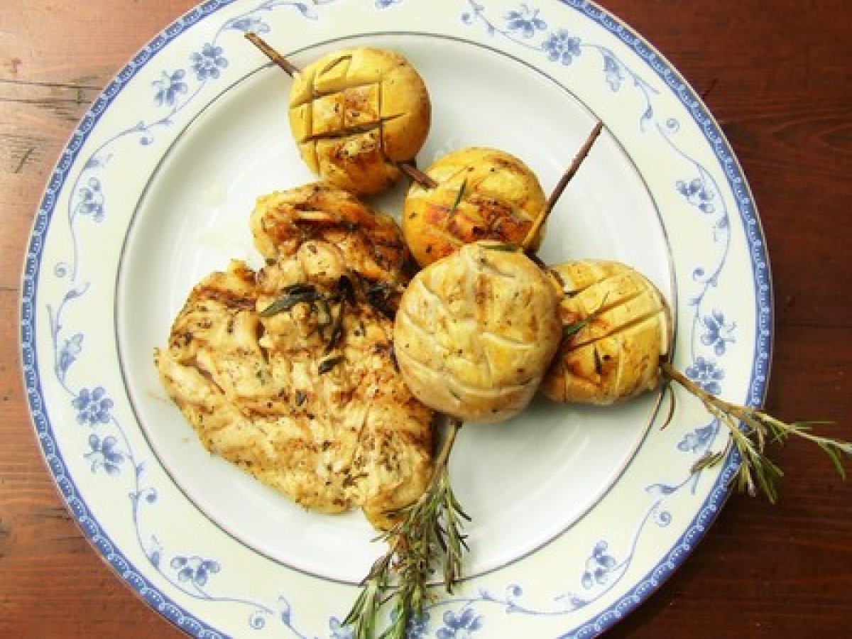 Poulet mariné au bbq & brochette de champignons au romarin