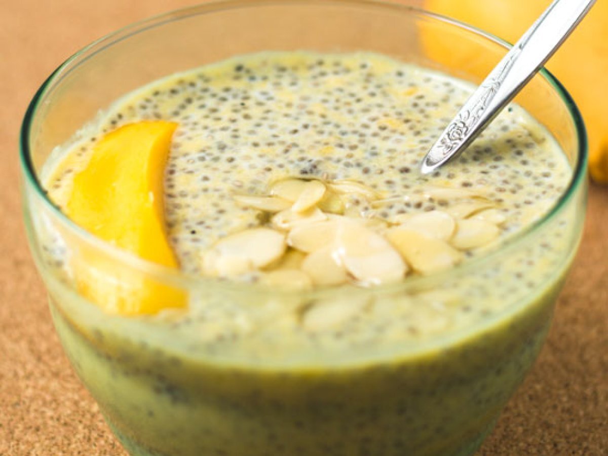 Si vous voulez varier un peu vos petits-déjeuners, ce pouding aux graines de chia et à la mangue est un bon choix. Le chia, auquel je viens de faire la connaissance récemment est une graine semblable au lin: oméga-3, fibres, calcium et fer. Les graines de chia remplacent les oeufs dans les pâtisseries (pas encore essayé) et donnent instantenément l’impression de satiété