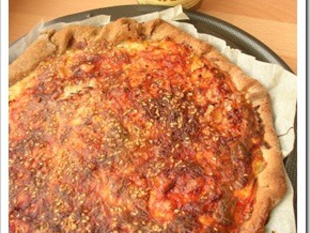 - Étaler la pâte, y déposer les légumes, mettre l' appareil a crème, parsemer de fromage et de graines de sésame!
