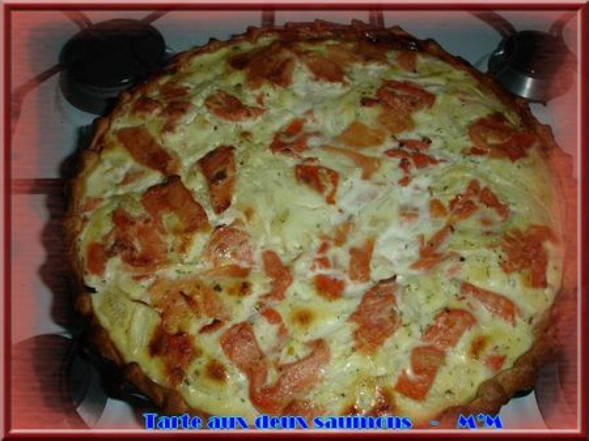 Tarte aux deux saumons votez maintenant Autrefacile1 h 5 m Envoyer cette recette à un ami Imprimer cette page Poser une question à l'auteur Publier votre photo de cette recette Ingrédients 4 1 pâte brisée 200 g de saumon fumé 600 g de saumon frais 3 gros oignons nouveaux 30 cl de crème fraîche épaisse 2 oeufs Sel, poivre, épices pour poisson à base d'aneth Pâte brisée : 350 g de farine 3/4 cuillères à café de sel 125 g de beurre 1.5 dl d'eau 1 trait de vinaigre 2 cuillères à soupe de parmesan