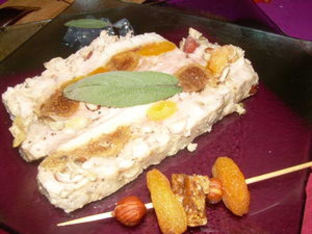 Terrine de lapin aux fruits secs votez maintenant Autrefacile2 h 15 m Envoyer cette recette à un ami Imprimer cette page Poser une question à l'auteur Publier votre photo de cette recette Ingrédients 6 1 lapin et 2 cuisses désossés 400 g de poitrine de porc hachée 1 crépine j'en ai pas trouvé 2 oeufs 3 échalotes 150 g d'abricots secs 150 g de figues sèches 100 g de noisettes décortiquées 15 cl de vin blanc 5 cl de cognac 1 sachet de gelée 20 g de beurre 1 cuillère à café de "4 épices" 1 pincée de marjolaine Sel poivre