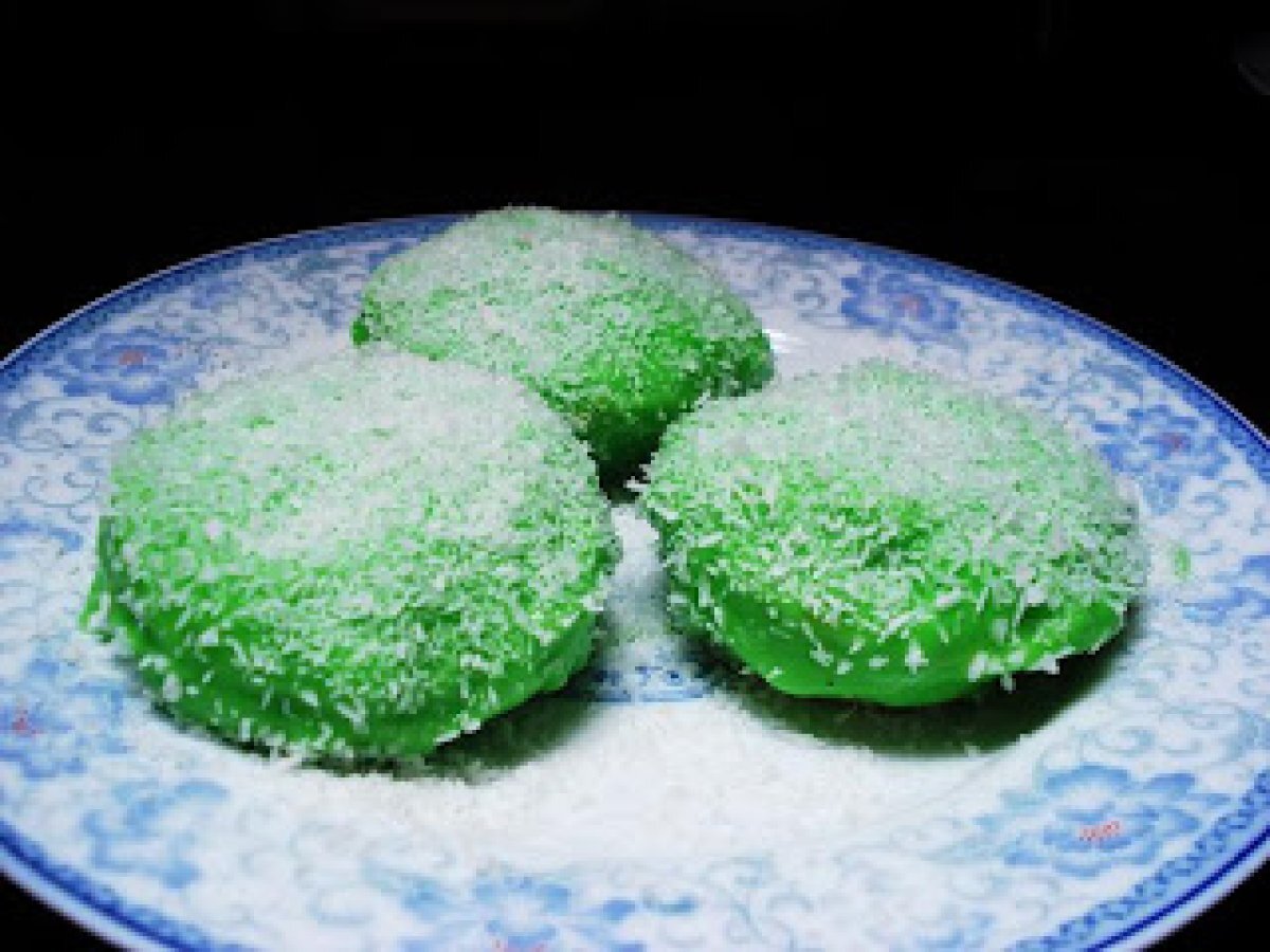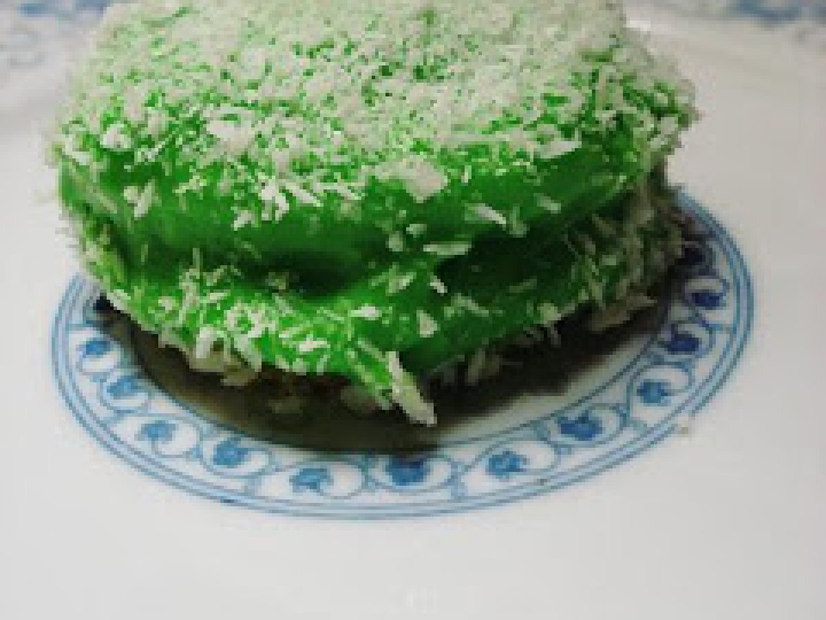 Dans un bol, mélanger le jus de pandan, la farine de riz et la farine de tapioca. Ajuster la couleur. Quand le lait de coco commence à bouillir, baisser le feu et verser doucement ce mélange dans la casserole tout en mélangeant. Mélanger sans arrêt pour éviter les grumeaux, car la crème épaissit très très vite. Continuer à chauffer en mélangeant jusqu'à ce que la crème soit bien élastique et qu'on puisse former des rubans en soulevant la masse. Couper le feu et continuer à mélanger un peu pour faire refroidir légèrement la crème. - 3) Montage:
