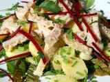 Ingrédients: 1 belle betterave rouge du potager 1cc gingembre émincé bio 1cc de moutarde (à l'ail des ours) 1cc d'aïoli aux oeufs frais fleur de sel au piment...