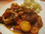 Ingrédients: 2 tranches de jarret de boeuf 3 oignons 3 gousses d'ail 6 carottes 1 panais 200 gr d'olives vertes 250 ml de sauce tomates bouillon de pot au feu...