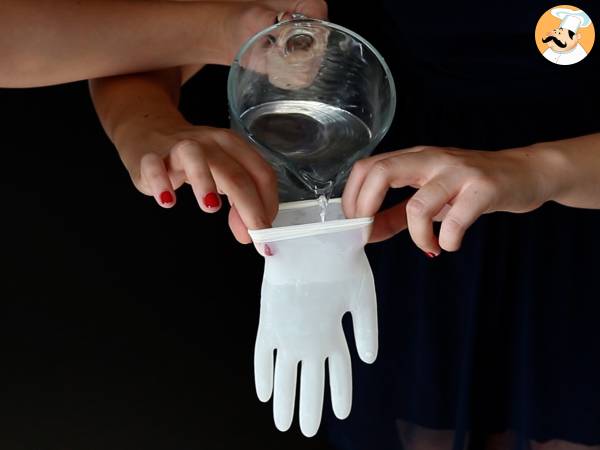Verser de l'eau dans des gants jetables en laissant un petit espace en haut afin de pouvoir ensuite refermer le tout en faisant un nœud.