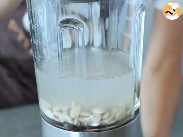 Égoutter les amandes et les mettre dans un blender. Ajouter les 600 ml d'eau et mixer.