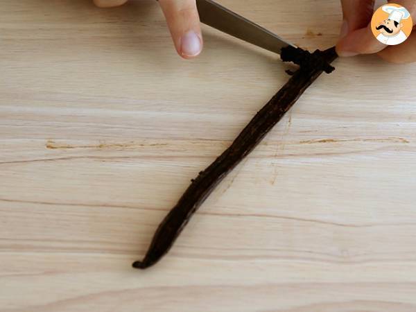 Récupérez les graines de la gousse de vanille, et ajoutez les au mélange. Mélangez bien.