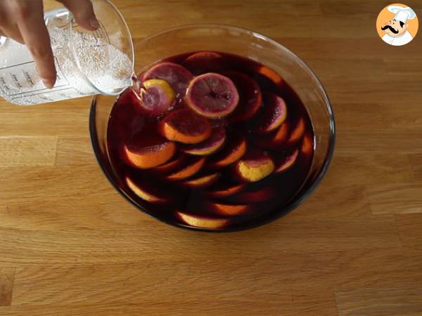 Versez le vin rouge dessus, ajoutez le sucre, le bâton de cannelle, et le Cointreau. Mélangez et mettez au frais au minimum 24 heures.