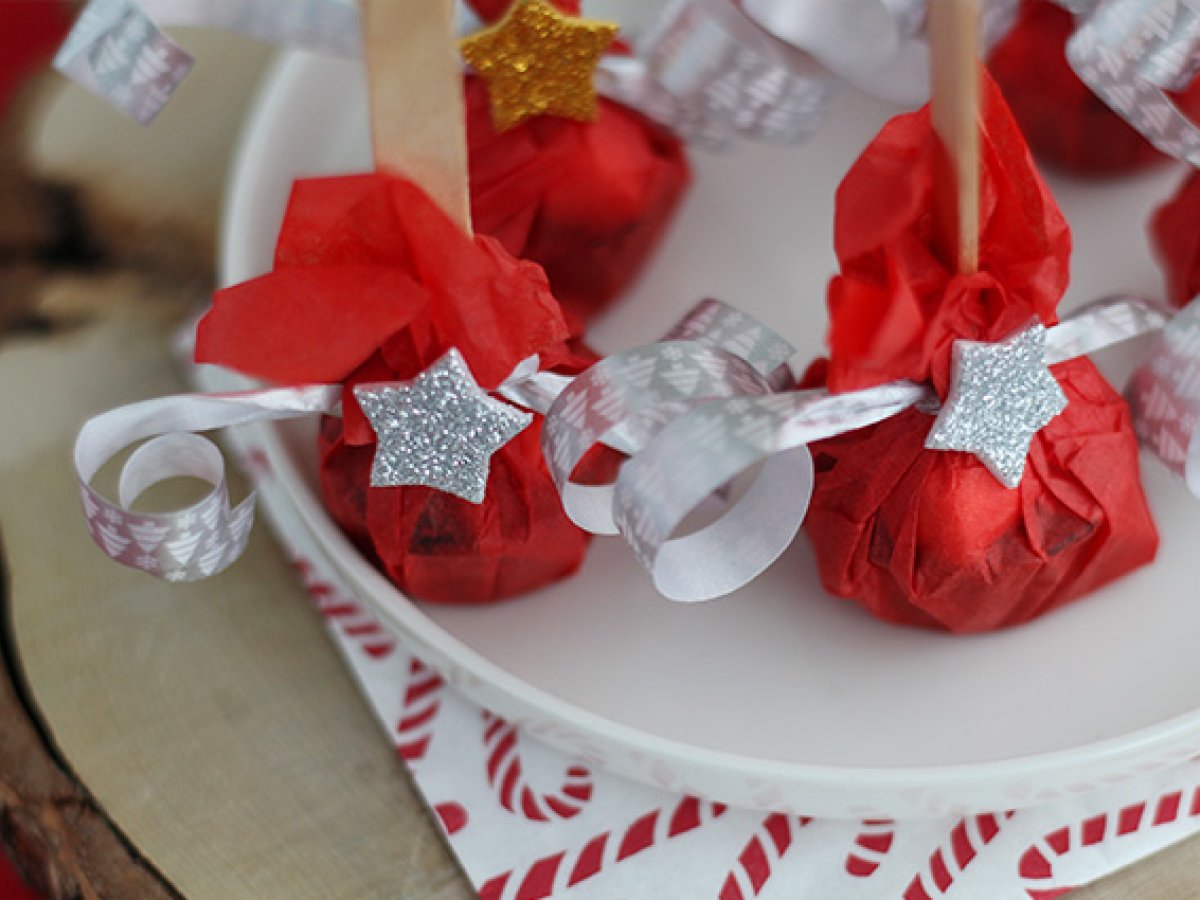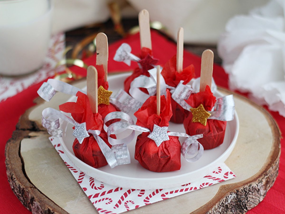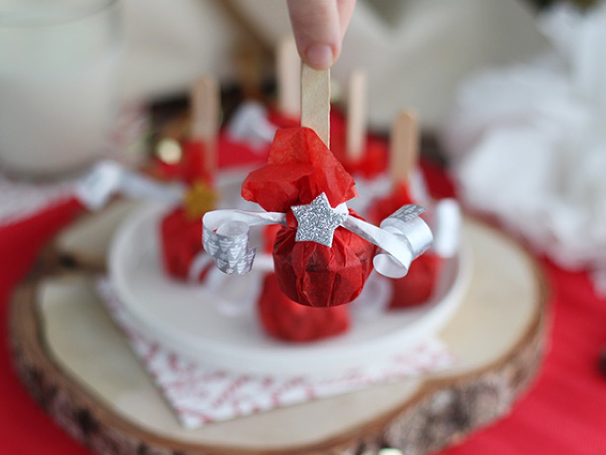 Démouler les chocolats, puis les déposer sur des carrés de papier crépon. Refermer le papier autour du bâtonnet puis sceller avec du bolduc. Faire boucler le bolduc avec les ciseaux puis coller l'autocollant sur le nœud.