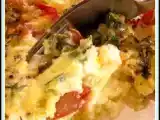 Ingrédients: 400 grammes de tomates cerise 200 grammes de feta 1 oignon nouveau quelques brins de thym 4 oeufs 1,5 dl de crème 2,5 dl de lait 2 cuillères à...